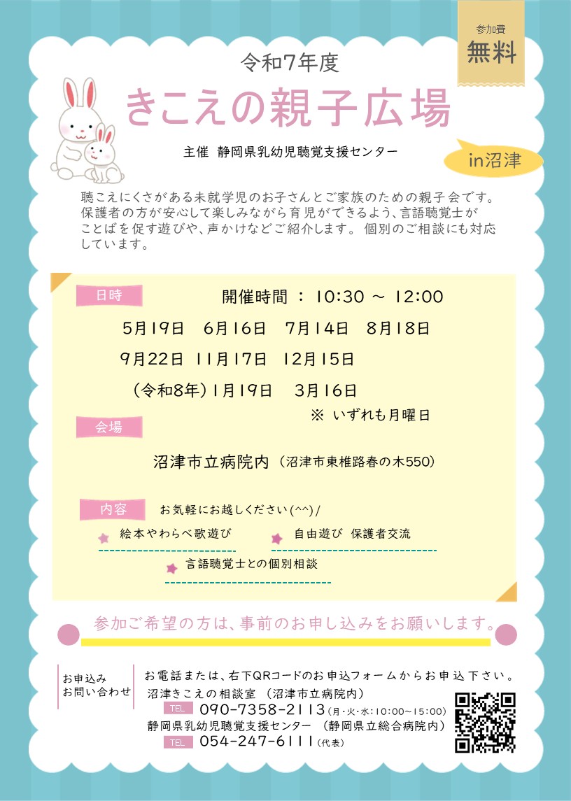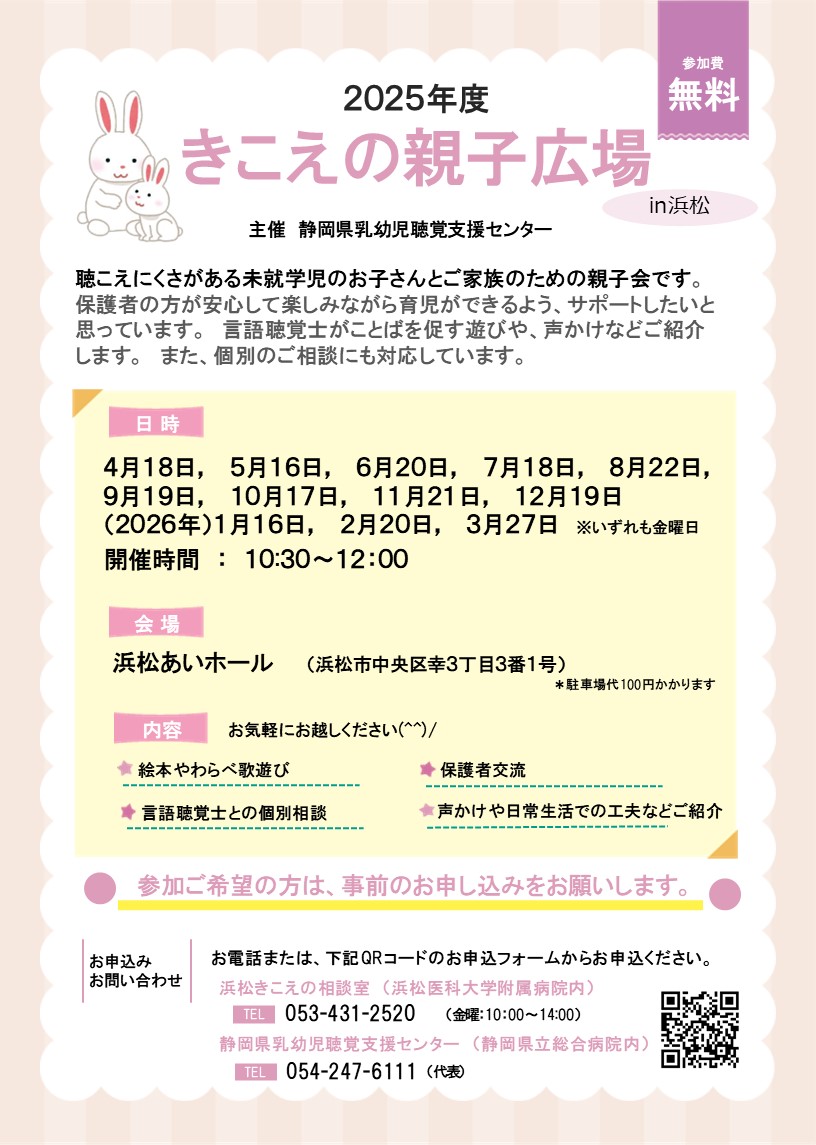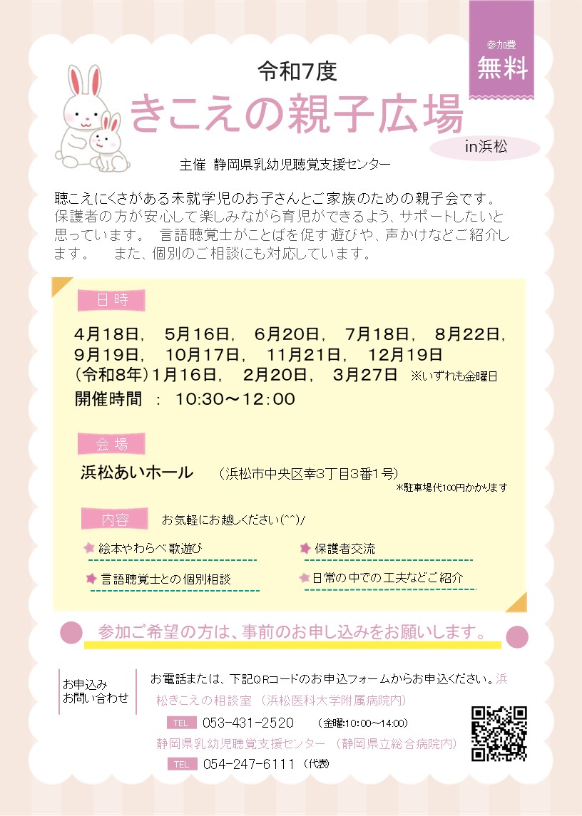 電話番号:054-247-6111(代表)「乳幼児聴覚支援センターへ」とお伝えください。